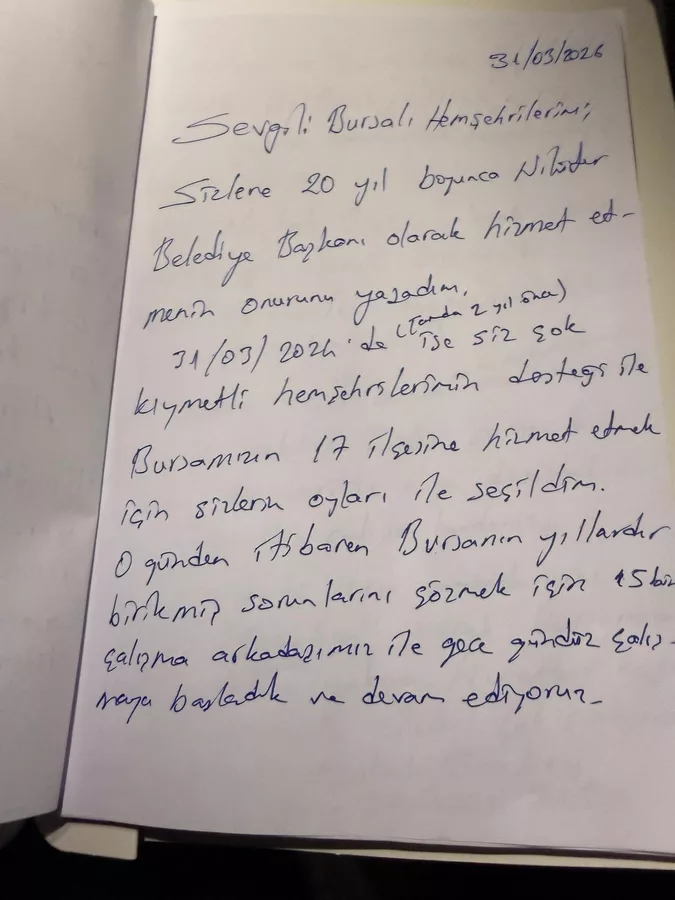 Bozbey mesajında, Nilüfer Belediye Başkanlığı döneminden başlayarak belediyecilik tecrübesine değinirken, 31 Mart 2024 seçimlerinde Bursa halkının desteğiyle Büyükşehir Belediye Başkanı seçildiğini ifade etti. Kentin 17 ilçesine hizmet etme sorumluluğunu taşıdıklarını vurgulayan Bozbey, çalışmalarına aynı kararlılıkla devam edeceklerini söyledi.