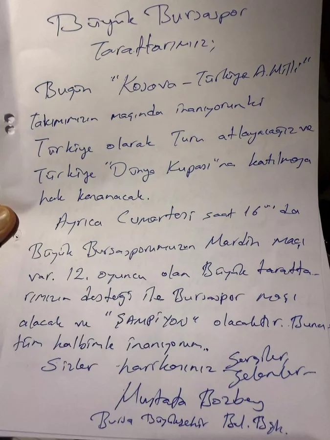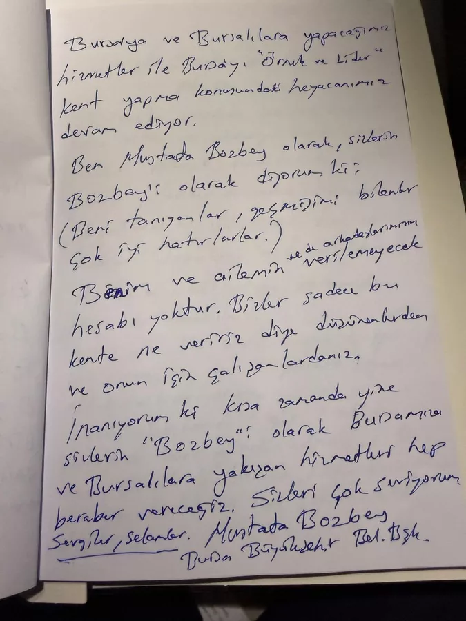 Gökçin ÖDÜL/MUDANY OLAY –  Bursa Büyükşehir Belediye Başkanı Mustafa Bozbey’in yürütülen soruşturma kapsamında gözaltına alınmasının ardından, Bozbey’in sosyal medya hesabından Bursalılara ve Bursaspor taraftarlarına hitaben yazdığı bir mektup paylaşıldı.