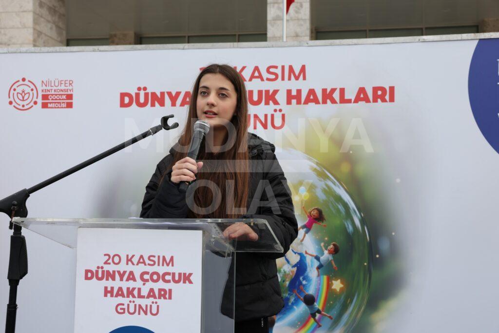 Nilüfer Kent Konseyi Çocuk Meclisi Başkanı Yasemin Arslan da çocukların katılım haklarını kullanabildikleri en önemli platformun Çocuk Meclisi olduğunu ifade etti. Bu yılki temayı “su israfı” olarak seçtiklerini belirten Arslan, “En önemli haklardan biri temiz suya ve gıdaya ulaşımdır. Su bizi hayatta tutuyor ama kaynaklarımız sonsuz değil. Her damlası, bizim ve tüm canlıların yaşamı için kritik. Bu yüzden ‘Bir Damla Su, Bir Dünya Yaşam’ diyoruz ve herkesi haklarımıza sahip çıkmaya çağırıyoruz” ifadelerini kullandı.